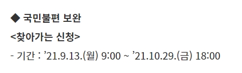거동이 불편하시거나 고령자 등과 같은 분들을 대상으로 하는 직접 방문하여 지원금 신청을 도와드리는 찾아가는 신청 서비스도 있는데요. 2021년 9월 13일 월요일부터 10월 29일 금요일 오후 6시까지 신청이 가능하다고 합니다. 콜센터 1533-2021로 신청을 하시면 되는데요.