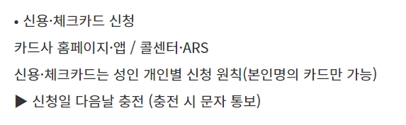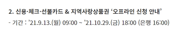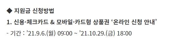 온라인 신청기간은 9월 6일 오전 9시부터 10월 29일 오후 6시까지 신청이 가능하다고 합니다. 신용카드 또는 체크카드로 받으려면 카드사 홈페이 또는 앱, 콜센터, ARS를 통해 성인 개인별로 신청해야 한다고 합니다. 신청자 본인 명의의 카드만 신청이 가능하며, 모바일 또는 카드형 지역사랑상품권으로 받으려면 지역상품권 앱에서 신청하면 된다고 합니다.