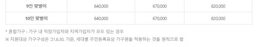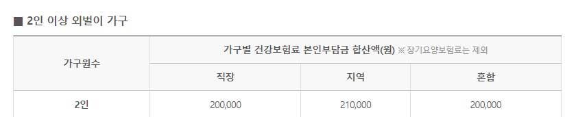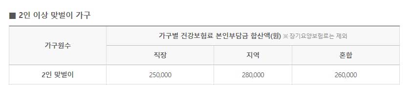 2인 맞벌이 가구는 직장 건강보험료 25만 원 이하 지역 건강보험료 28만 원 이하에서 혼합은 26만 원 이하에서 대상이 됩니다. 3인 맞벌이는 직장 건강보험료 31만 원 이하 지역 건강보험료 35만 원 이하에서 혼합은 33만 원 이하에서 대상이 된다고 하니, 위 표를 참고해서 본인의 가구의 건강보험료를 감안해서 판단하셔도 좋을 것 같습니다.