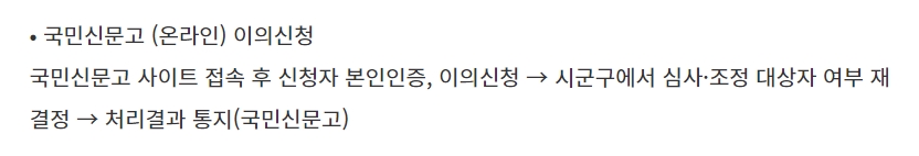 온라인 국민신문고 이의신청은 사이트 접속 후 신청자 본인인증 및 이의신청 후 심사 및 조정 대상자 여부 재결경 다음 처리결과 통지가 된다고 합니다. 오프라인 주민센터 이의신청은 주민센터 방문 후 이의신청서 및 증빙서류 제출 후 관련 서류 송부 후에 심사 및 조정 대상자 여부 재결경 후에 결과 통지가 된다고 합니다.