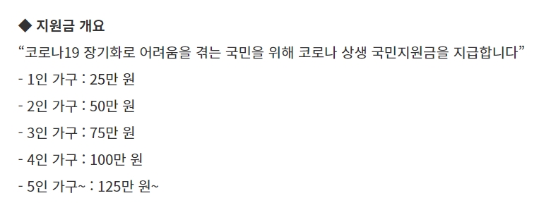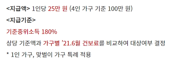 코로나 장기화로 힘든 상황에 처한 다수의 국민들을 지원하기 위해 지급하는 지원금이 바로 코로나 상생 국민지원금인데요. 기준은 21년 6월 건강보험료가 국민지원금 건강보험료 기준액(기준 중위소득 180% 상당) 보다 낮을 경우에 해당되며, 1인당 25만 원씩 지급된다고 합니다. 1인 가구는 25만 원, 2인 가구는 50만 원, 3인 가구는 75만 원 이런 식으로 지급이 된다고 하는데요.