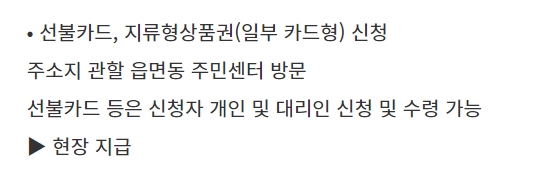지류형 지역사랑상품권 또는 선불카드로 받으려면 읍면동 주민센터에 방문해서 신청할 수 있다고 합니다. 선불카드 및 지류형 지역사랑상품권은 현장에서 바로 지급받을 수 있다고 합니다.