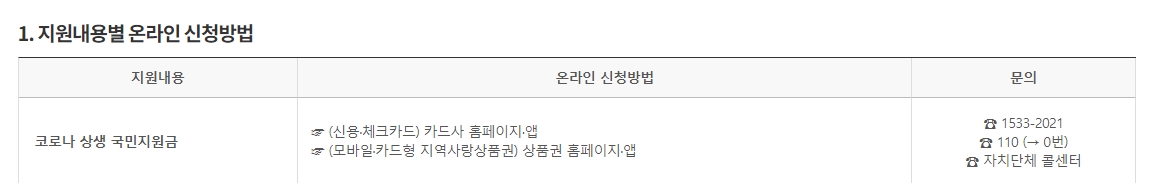 그 외에도 궁금하거나 불편한 사항이 있다면 국민지원금 전담 콜센터인 1533-2021으로 연락하거나 정부합동민원센터인 110과 자치단체 콜센터를 통해서 국민지원금 관련 상담을 받아 보실 수 있다고 하니 참고하면 좋을 것 같습니다.