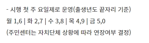 시행 첫째 주에는 요일제로 운영된다고 하며 주민센터 같은 경우에는 자치단체 상황에 따라 연장 여부가 결정된다고 하니 출생년도 끝자리 별 요일을 잘 확인해서 차질 없이 신청하는 게 좋을 것 같습니다. 월요일은 출생년도 끝자리 1과 6, 화요일은 2와 7, 수요일은 3과 8, 목요일은 4와 9, 금요일은 5와 0이니 참고하세요.