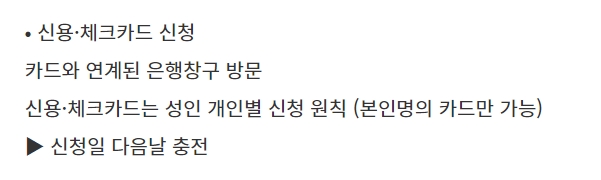 국민지원금 오프라인 신청기간은 온라인 신청보다 한주 뒤인 21년 9월 13일 월요일 오전 9시부터 10월 29일 오후 6시까지라고 합니다. 은행은 업무시간상 오후 4시까지 가능하다고 하니 참고하시고요. 신청자 본인 명의 카드만 신청이 가능하며, 성인 개인별로 신청이 원칙이라고 합니다. 신용카드와 체크카드로 받으려면 카드와 연계된 은행 창구를 방문해야 합니다. 신용카드 또는 체크카드로 신청하면 신청 다음날 충전이 된다고 합니다.