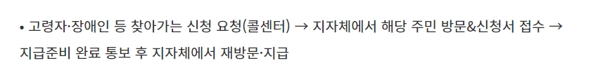 과정은 고령자 또는 장애인 등 찾아가는 신청 서비스를 요청하시면 지자체에서 해당 주민 방문 및 신청서를 접수한다고 합니다. 그리고 지급준비 완료 통보 후 지자체에서 재방문 및 지급을 완료한다고 합니다.