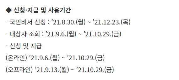 신청 및 지급은 온라인 신청은 9월 6일부터 10월 29일까지라고 합니다. 오프라인 같은 경우에는 9월 13일부터 10월 29일까지라고 하니 착오 없이 신청하시는 게 좋을 것 같습니다.
