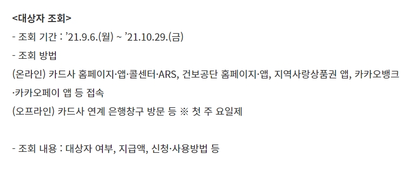 국민지원금 지급 대상자 조회는 9월 6일부터 10월 29일까지 가능한데요. 시작은 9월 6일 월요일 오전 9시부터 온라인과 오프라인에서 확인이 가능하다고 합니다. 온라인 같은 경우에는 카드사 홈페이지, 앱, 콜센터, ARS, 건강공단 홈페이지, 건강공단 앱, 지역상품권 앱, 카카오뱅크, 카카오페이 등 다양한 매체를 통해서 조회가 가능합니다. 오프라인 조회 방법은 카드사 또는 연계 은행 창구 방문을 하시면 됩니다.