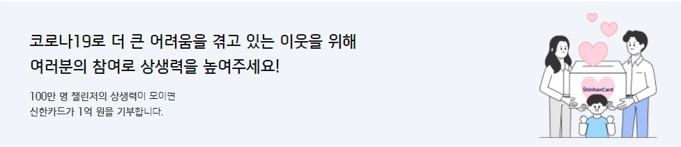 더 가치있게에서는 코로나19로 더 큰 어려움을 겪고 있는 이웃을 위해 100만 명의 챌린저의 상생력이 모이면 신한카드가 1억 원을 기부하는 이벤트라고 하는데요. 기간은 2021년 8월 30일부터 2021년 12월 31일까지이며, 참여방법은 신한카드 국민지원금 꿀팁 페이지 하단의 '100만 상생력 챌린지 참여하기' 버튼을 클릭하면 참여가 된다고 합니다. 참여를 위해서는 로그인이 필요하며 기부처는 사랑의 열매라고 합니다.