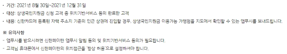처음에 잠깐 이야기한 집근처 지원금 가맹점을 앱푸시로 받아볼 수 있다고 합니다. 우리동네 지원금 이용가게 알리미라는 서비스인데요. 기간은 2021년 8월 30일부터 2021년 12월 31일까지로 상생국민지원금 신청 고객 중 위치기반 서비스 동의를 완료한 고객만 서비스를 받아볼 수 있다고 합니다. 신한카드에 등록된 자택 주소지 기준의 인근 상권에 진입할 경우에 상생국민지원금 이용 가능 가맹점을 지도에서 확인할 수 있는 앱푸시를 보내준다고 합니다.
