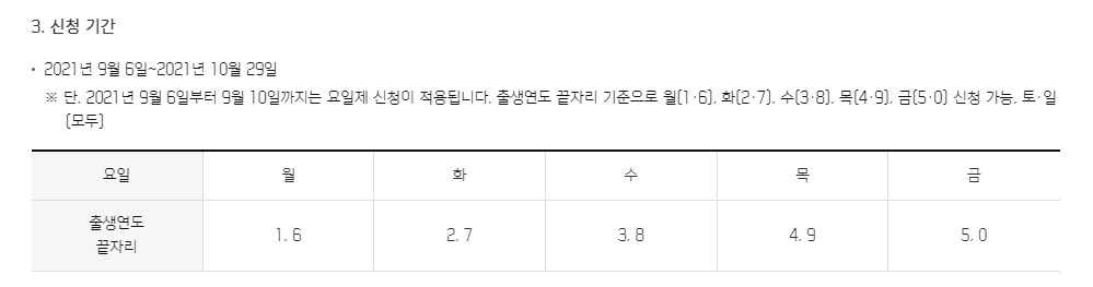 신청 기간은 2021년 9월 6일부터 2021년 10월 29일 까지인데요. 신청 첫째 주인 2021년 9월 6일부터 9월 10일까지는 요일제 신청이 적용되어, 출생연도 끝자리 기준으로 월요일(1, 6), 화요일(2, 7), 수요일(3, 8), 목요일(4, 9), 금요일(5, 0)이 신청 가능하다고 합니다.