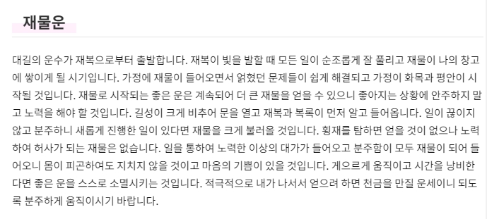 2026년 농협 무료토정비결 결과는 총론에서 대략적인 운세를 미리 볼 수 있었는데요. 저는 좁은 우물에서 벗어나 넓은 세상으로 나아가게 될 것이라는 말이 있어서 내년이 더 기대가 되었는데요. 다음으로는 재물운, 직장 사업운, 가정 건강운, 이성 대인관계를 차례대로 볼 수 있었습니다. 개인적으로 재물운에서 대길의 운수가 재복으로부터 출반한다는 말이 있어서 내년 2026년이 빨리오면 좋겠다는 생각이 들었는데요.
