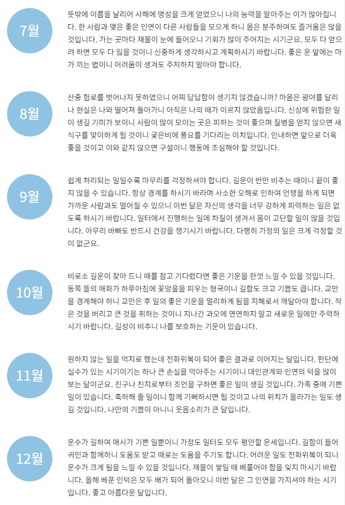 마지막으로 월별 세운에서는 내년 2026년 1월부터 12월까지 각 달별 운세를 자세하게 볼 수 있었습니다. 저는 2월과 5월, 8월에 어려움이 있다고 되어있지만, 어려움이 있은 다음달에눈 문제가 해결된다는 말들이 있어서 그나마 다행이란 생각이 들었습니다.