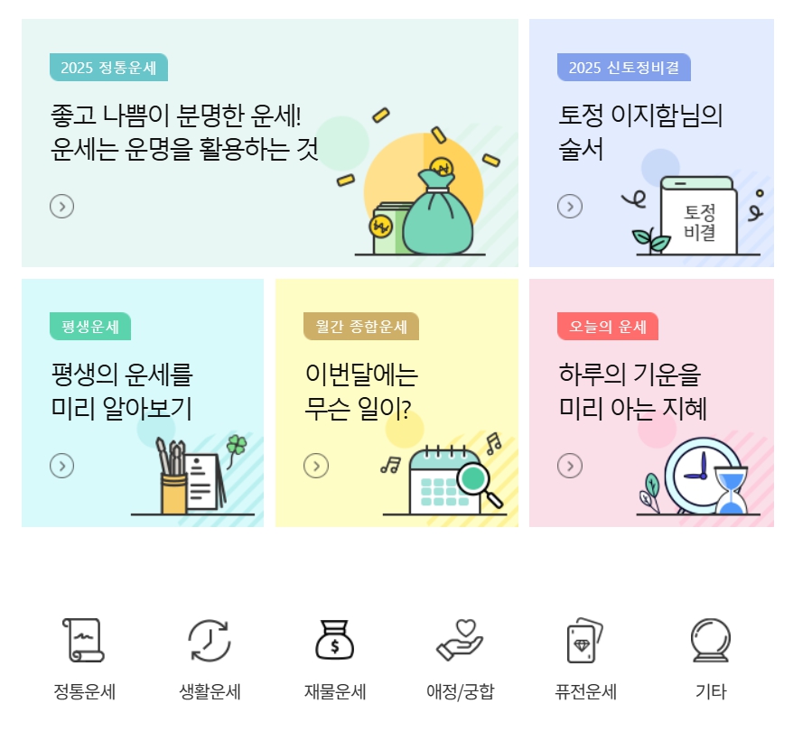정통운세에서는 평생운세, 10년대운, 2026 정통운세, 2026 신토정비결, 2026 벼락부자비법, 월간 종합운세를 볼 수 있고요. 생활운세에서는 주간 종합운세, 오늘의 운세, 자녀관리, 나의 성격, 신기한 동물점, 좋은날 받기를 볼 수 있었습니다. 재물운세에서는 오늘의 재물 및 투자운, 프리미엄 로또운세, 대통령 로또운세를 볼 수 있고요. 애정/궁합에서는 2026 운명의 사랑찾기, 내 운명의 배우자, 오늘의 종합애정운, 정통궁합, 별자리궁합, 혈액형궁합을 볼 수 있었습니다. 퓨전운세에서는 별자리, 혈액형, 주간 별자리, 월간 별자리, 오늘의 띠별, 주간 띠별, 연간 띠별을 볼 수 있고요. 기타에서는 프리미엄 꿈해몽, 사상오행, 심리테스트를 볼 수 있으니 참고하시면 좋을 것 같습니다.